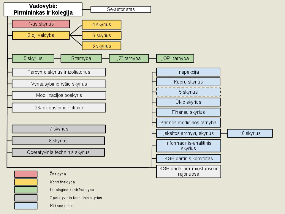 Šias funkcijas įgyvendino keli operatyviniai padaliniai, kurie šioje interneto svetainėje nagrinėjami išsamiau. Tai Lietuvos SSR KGB 1-asis skyrius, kontržvalgybos padaliniai (2-oji valdyba, 3-iasis, 4-asis ir 6-asis skyriai), ideologinės kontržvalgybos padalinys ir Tardymo skyrius. Pagalbą jiems teikė Operatyvinis techninis ir 7-asis skyriai.